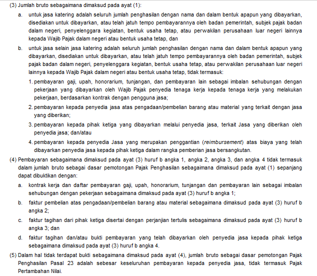 Dasar Pengenaan Pajak (DPP) PPh Pasal 23 atas jasa adalah dari jumlah bruto. Untuk rincian dan definisi mengenai jumlah bruto, pihak yang bersangkutan wajib merujuk pada ketentuan yang terdapat dalam Pasal 1 ayat (3) Peraturan Menteri Keuangan Nomor 141/PMK.03/2015.